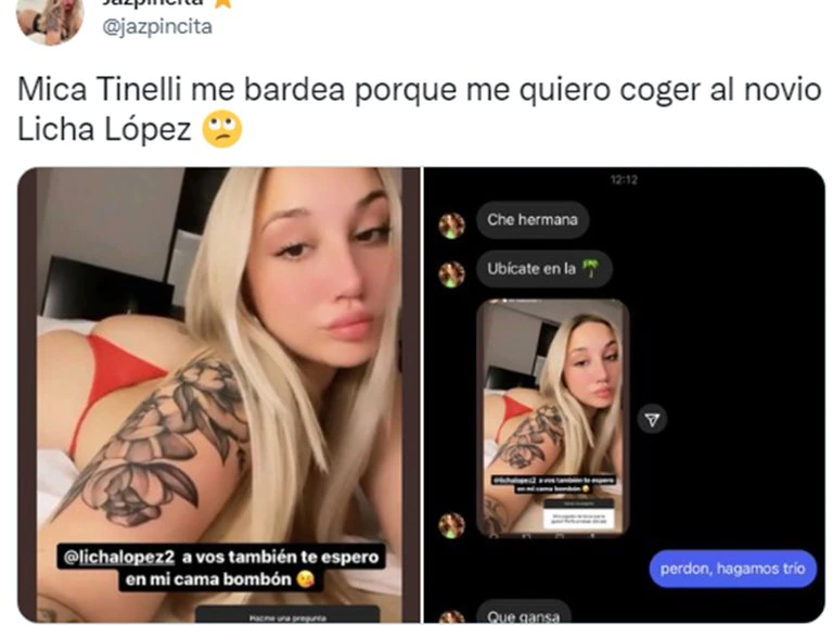 Minutos después, la actriz porno viralizó los mensajes en Twitter: “Mica Tinelli me bardea porque me quiero cog… al novio Licha López. Yo solo quería darle suerte a Boca”, escribió con las capturas de pantalla.