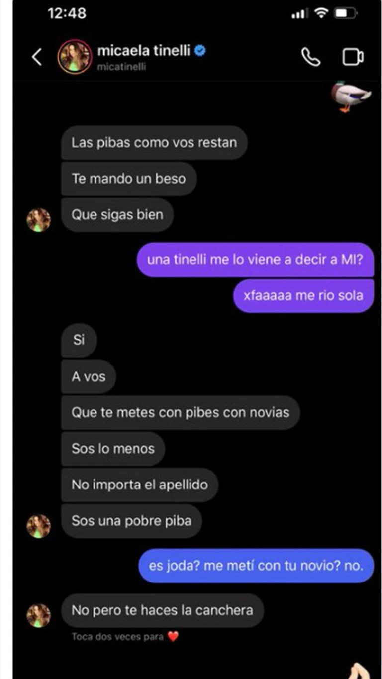 “Las pibas como vos restan. Te mando un beso, que sigas bien”, intentó cerrar la conversación la mayor de las hijas del conductor y Jazpincita siguió: “¿Una Tinelli me lo viene a decir a mi? Por favor, me río sola”. “Sí. A vos que te metes con pibes con novias. Sos lo menos, no importa el apellido, sos una pobre piba”, agregó Mica su adversaria dijo “¿Es joda? ¿Me metí con tu novio? No”. “No, pero te haces la canchera”, cerró la empresaria.