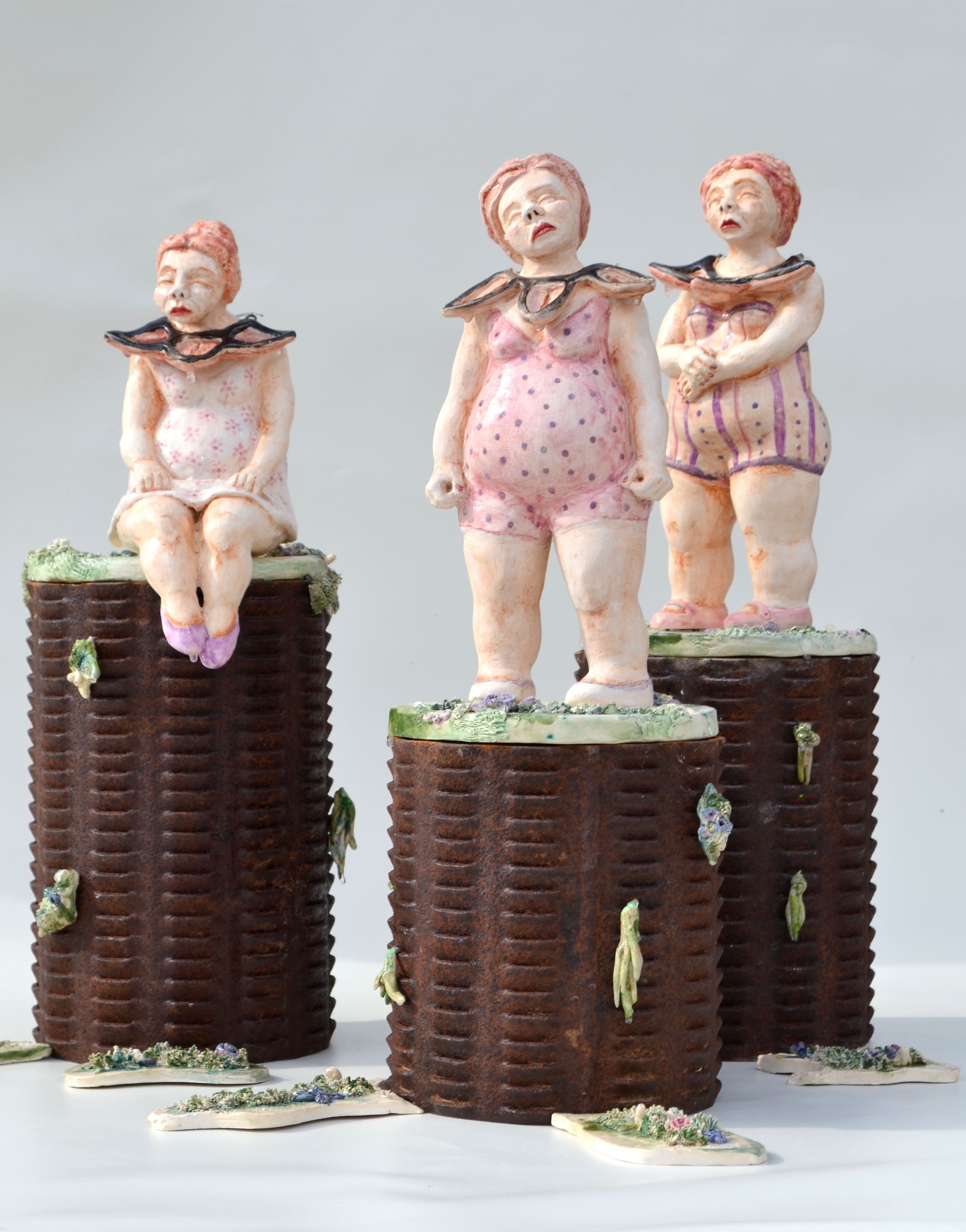 Abajo de estas, Laguna, de Silvina Martínez; Carnaval de antaño, de Rufino Palomas;y Artilugio portátil para reciclar tristezas, de Mariana Bernal (izq.).