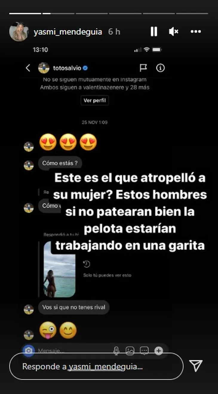 ¿Este es el que atropelló a su mujer? Estos hombres si no patearan bien la pelota estarían trabajando en una garita", sentenció la ex Gran Hermano junto a la captura en la que Toto Salvio la piropeaba y le ponía emojis sugerentes.