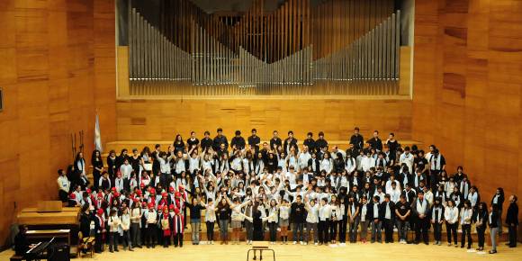 Después de una larga hora protocolar de entrega de certificados, llegó la música y las emociones. El escenario del Auditorio Juan Victoria se cubrió con 200 chicos, que formaron tres coros -divididos por edades- y que cantaron individualmente y después en perfecta armonía todos juntos, bajo la dirección de Santiago Ruiz. Fueron 11 obras, entre clásicas y populares, las que interpretaron los niños y jóvenes. Fueron ovacionados por la sala, que quedó chica y por eso se había previsto colocar pantallas gigantes en ambos foyers para que siguieran desde afuera el espectáculo. El gobernador José Luis Gioja estuvo en la platea.