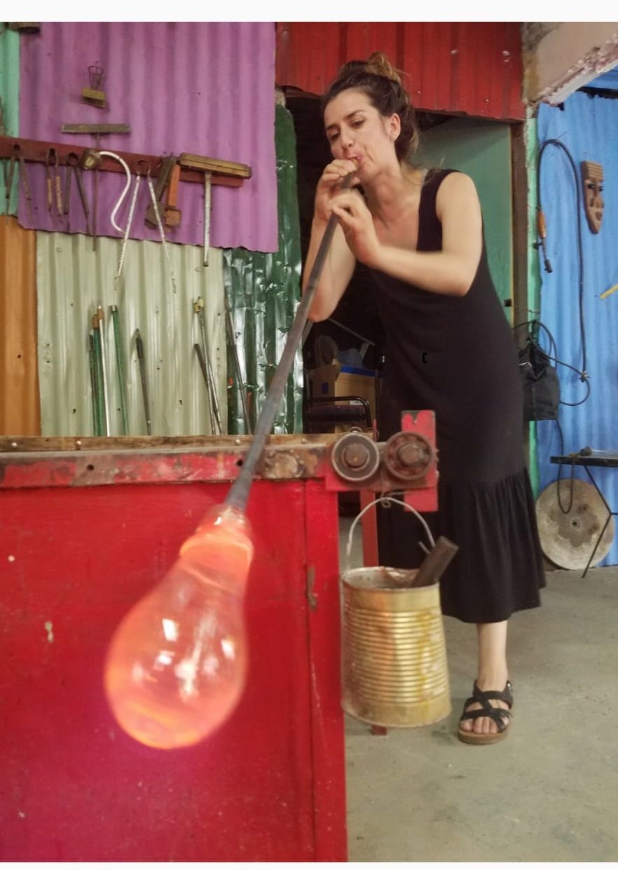 Candelaria, quien es autora de la escultura "Oda al agua" ubicada en el Complejo Ambiental Anchipurac y se formó en vidrio en la Escola De Cerámica de la Bisbal de Girona y en Argentona en Cataluña, ha realizado el soplado en la fábrica de vidrio soplado de Buenos Aires El progreso. "Uno lleva su proyecto y van sacando vidrio a más de mil grados, se va soplando, uno va guiando a esos maestros sopladores… y en otro taller más pequeño de soplado, he podido hacer mis propias experiencias de soplado. En San Juan no existe en este momento ningún horno de esta complejidad, donde se pueda soplar vidrio. En Argentina hay ahora solamente dos fábricas que han resistido a las crisis y son las que producen todo el vidrio utilitario, pero los fines de semana podemos ir los escultores y hacer nuestras piezas ahí" relató la sanjuanina que tiene como maestro y mentor a Osvaldo Pontecorvo, "que es el mayor tallador de vidrio checo que hay en Latinoamérica" dice, y quien le ha dado terminación a algunas de sus piezas de menor tamaño.