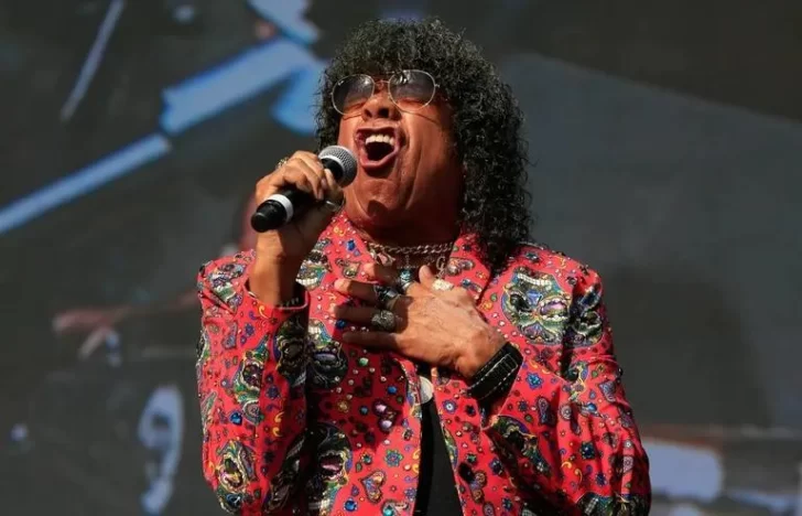 El cantante y compositor, de 71 años, actúa con una remera transparente sin mangas y un pantalón negro con arabescos amarillos mientras la temperatura en la Ciudad de Buenos Aires es de menos de 10 grados.