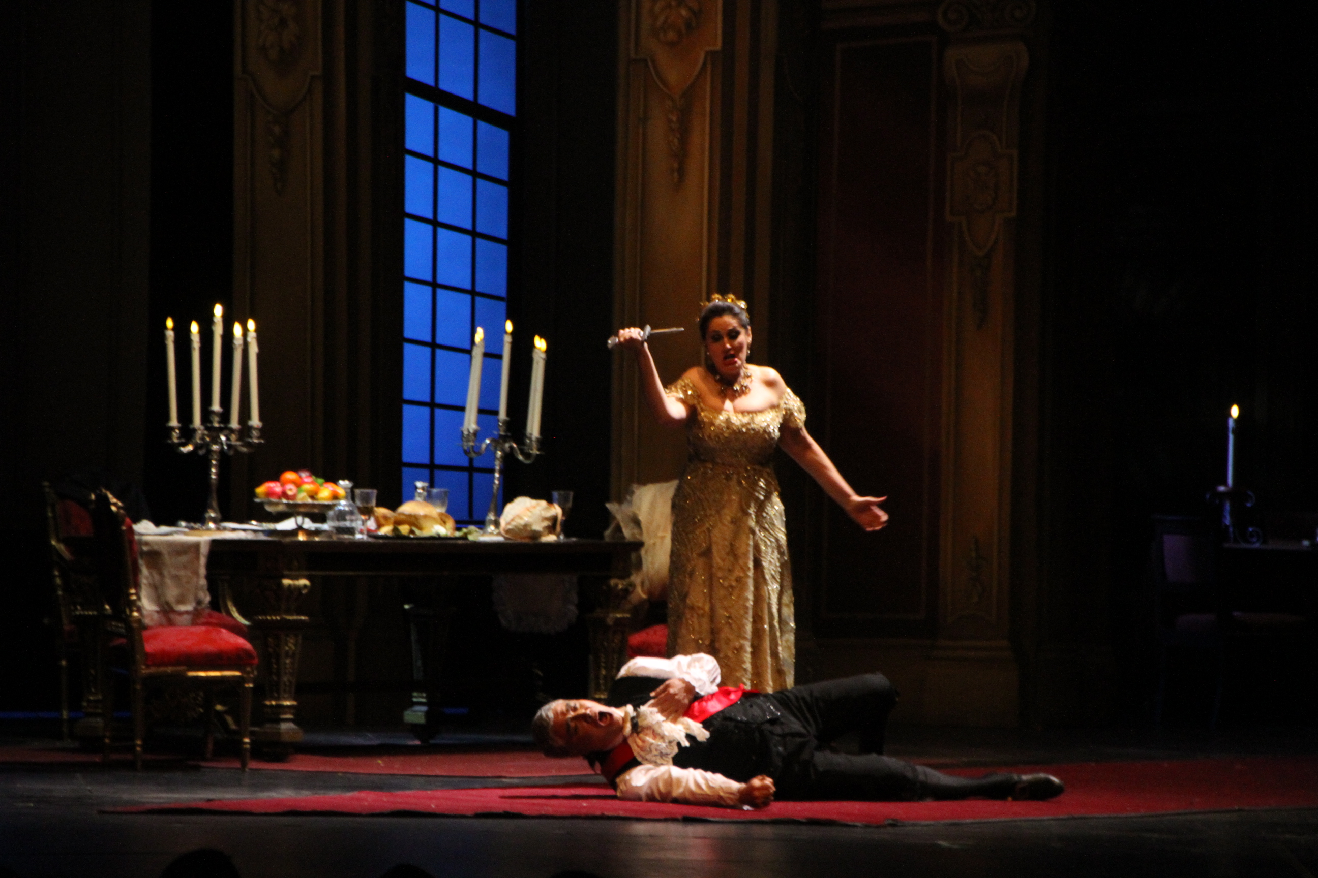 La primera función de Tosca en el Teatro del Bicentenario (a sala llena) obtuvo el pulgar arriba, ovaciones y fuertes sentimientos de júbilo por parte de los espectadores, que disfrutaron de un espectáculo de ópera con todo lo que tiene que tener: pasión, tragedia, drama, traición; pero además voces rotundas, una musicalización sin fisuras, actuaciones precisas y una producción escenográfica de gran encanto. Todo se fusionaba en una explosión de emociones en los tres actos. Este es el último espectáculo lírico del 2017 del TDB, que contó con la actuación de los solistas, dirección escénica, escenografía (diseñados por Aníbal Lápiz y Roberto Oswald) y vestuario (diseñado por Aníbal Lápiz) del Teatro Colón, más el Coro de Niños, el Coro Universitario y la Orquesta Sinfónica de la UNSJ. Para empezar, la potente voz de Mónica Ferracani (en el papel protagónico de Floria Tosca), conquistó los sentidos del público y se valió una gran ovación en los saludos de despedida. Su interpretación del aria “Vissi d’arte”, en el segundo acto, fue cautivante. El lamento por el destino de su amado, el pintor Mario Cavaradossi (Enrique Folguer) ante la crueldad del Barón Scarpia (Homero Pérez-Miranda) configuró un cuadro profundo, sensible y una actuación que desbordaba el espacio escénico. “He vivido del arte, he vivido del amor ¡nunca le he hecho mal a nadie…!”, cantaba la soprano. En cuanto a Folguer, en la aria “E lucevan le stelle”, una de las más famosas, que pertenece al tercer acto, e involucra a su personaje, el pintor Cavaradossi, logró evocar talentosamente el instante preciso en que está a punto de morir y ese violento final donde Tosca busca también la muerte para no dejarlo solo.