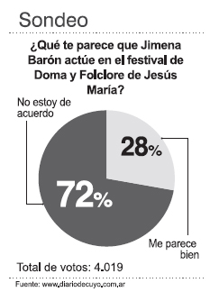 DIARIO DE CUYO Online lanzó un sondeo para saber qué opinan sus lectores acerca de que la cantante pop Jimena Barón integre la programación del Festival de Doma y Folclore de Jesús María. Más de 4 mil personas emitieron su voto en la web, y la amplia mayoría determinó que no está de acuerdo con mezclar los tantos, por más que se trate de una noche “aparte’. Apenas un 28% vio con buenos ojos esta “apertura’ que ya marca tendencia.