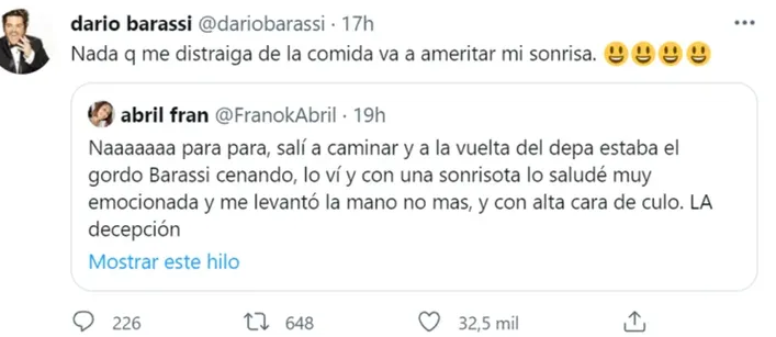 “Naaaaaaa pará pará, salí a caminar y a la vuelta del departamento estaba el gordo Barassi cenando. Lo vi y con una sonrisota lo saludé muy emocionada, y me levantó la mano no más, y con alta cara de culo. La decepción”, escribió la usuaria @FranokAbril en Twitter.