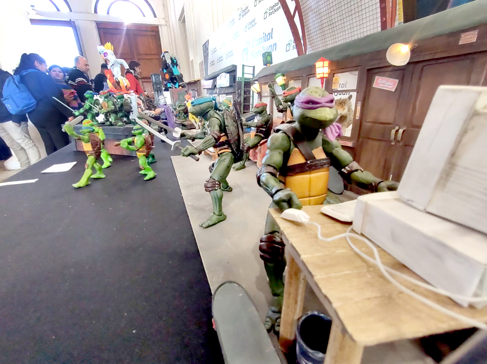 Para empezar, hubo tres stands repletos de figuras de acción, en diferentes escalas, de los personajes de la franquicia de Transformers. Desde Optimus Prime y Megatron, pasando por varios ejemplares de Guerra de Bestias, Dinobots y otros héroes y villanos reconocibles para los fans de las series animadas y las películas de Michael Bay, hasta la imponente figura de Devastador y el enorme Trypticon, (la megaciudad de los Decepticon, en la forma de un Tiranosaurio Rex) que fue realmente impactante para los visitantes. Después, había una serie de stands que tenían en común, a los "Héroes más poderosos de la tierra", efectivamente, Los Vengadores y también a su contraparte del Universo de DC, La Liga de la Justicia. Sin embargo, fue notable que entre los coleccionistas las diferentes versiones de Batman copaban la escena. Desde los comics, las series y la películas, el Caballero de la Noche fue el más disfrutado por el público, al igual que toda su galería de villanos, entre los cuales estaba Guasón y El Pingüino. En otro sector, otros aspectos destacables de la exposición fueron los "Dioramas", que son escenarios o sets construidos por los propios coleccionistas de forma artesanal donde recrean espacios, edificios o escenas de acción de diferentes personajes. Los padres se maravillaron con el set de Robocop, donde sale reposando en su silla de mantenimiento, o la guarida de las Tortugas Ninja, con detalles y terminaciones de lujo. En total, hay alrededor de 500 figuras y vehículos (un apartado también destacable con réplicas del batimóvil o el Auto Fantástico y el De Lorean de Volver al Futuro) en esta exposición que continuará abierta hoy en la estación de las 15hs. hasta las 21hs. con entrada libre y gratuita.