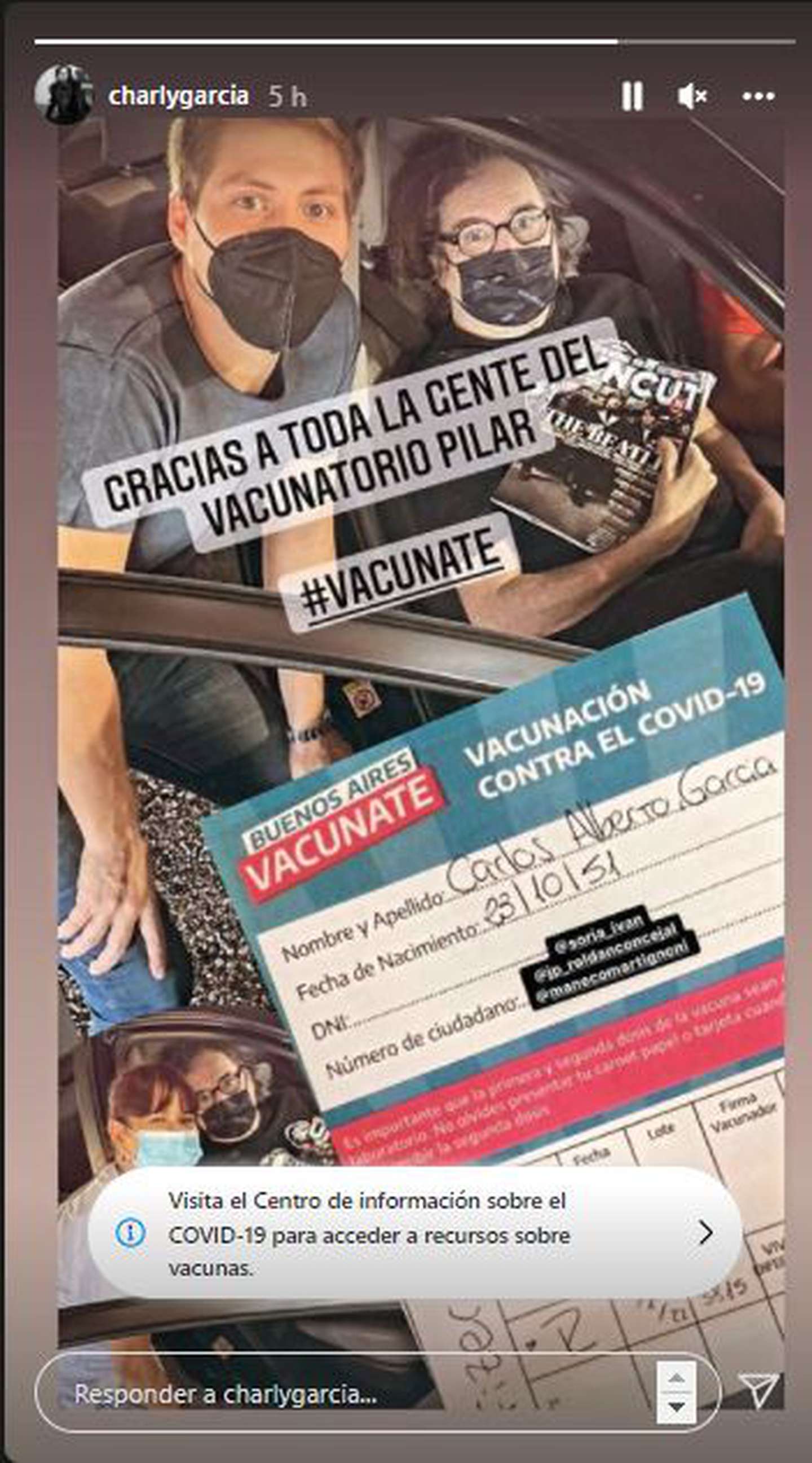 Allí, el cantante y compositor escribió: “Vacunate”. Acto seguido manifestó con gratitud: “Gracias a toda la gente del vacunatorio Pilar”.