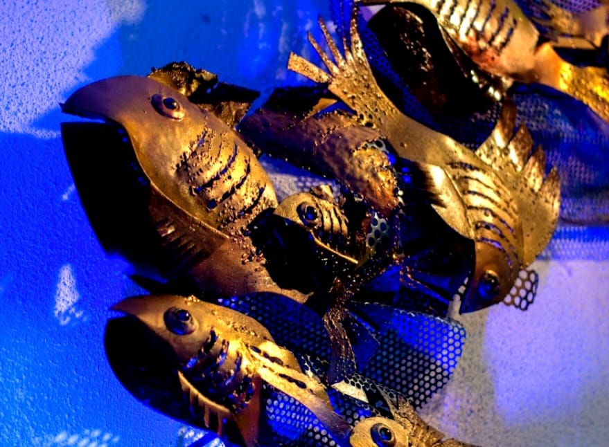 Hoy por hoy, sus peces nadan por su casa, dialogando con otras obras terminadas y en proceso que también la habitan. "Es que mi casa ya no es una casa (ríe), convertí todo en taller. En una parte, vitrofusión; en otra trabajo hierro… Es totalmente un taller, hasta en la cocina estoy comiendo y dibujando. No hay living ni nada, obra y obra, no puestas como en una galería, sino una al lado de la otra… Y yo feliz", contó Mirta, que en diciembre celebrará incansables 80 años de vida. En ese mágico laboratorio de arte se gestó y creó esta nueva exposición, a la que le ha dedicado soles y lunas, salvo en los momentos de merecido descanso.