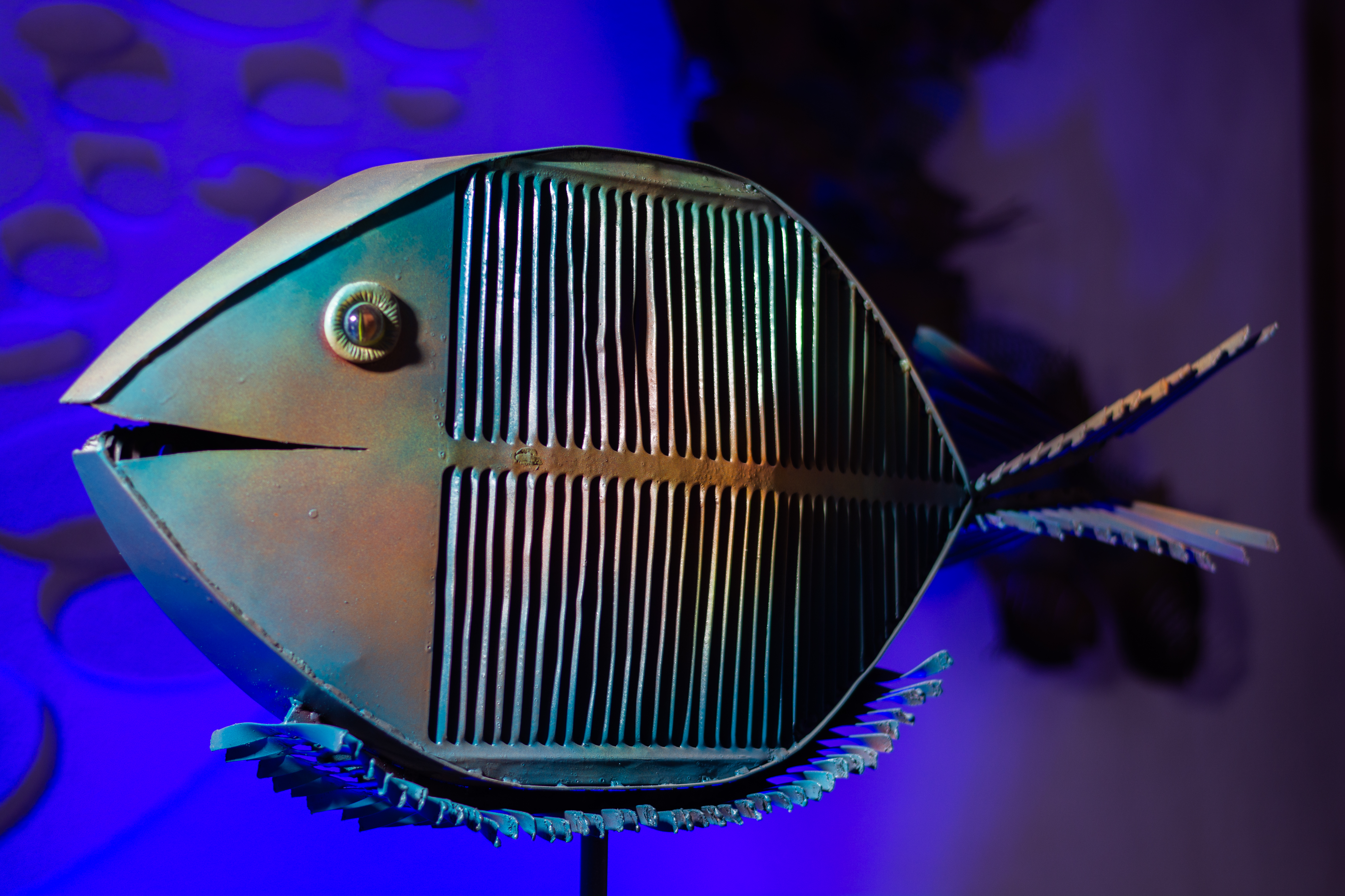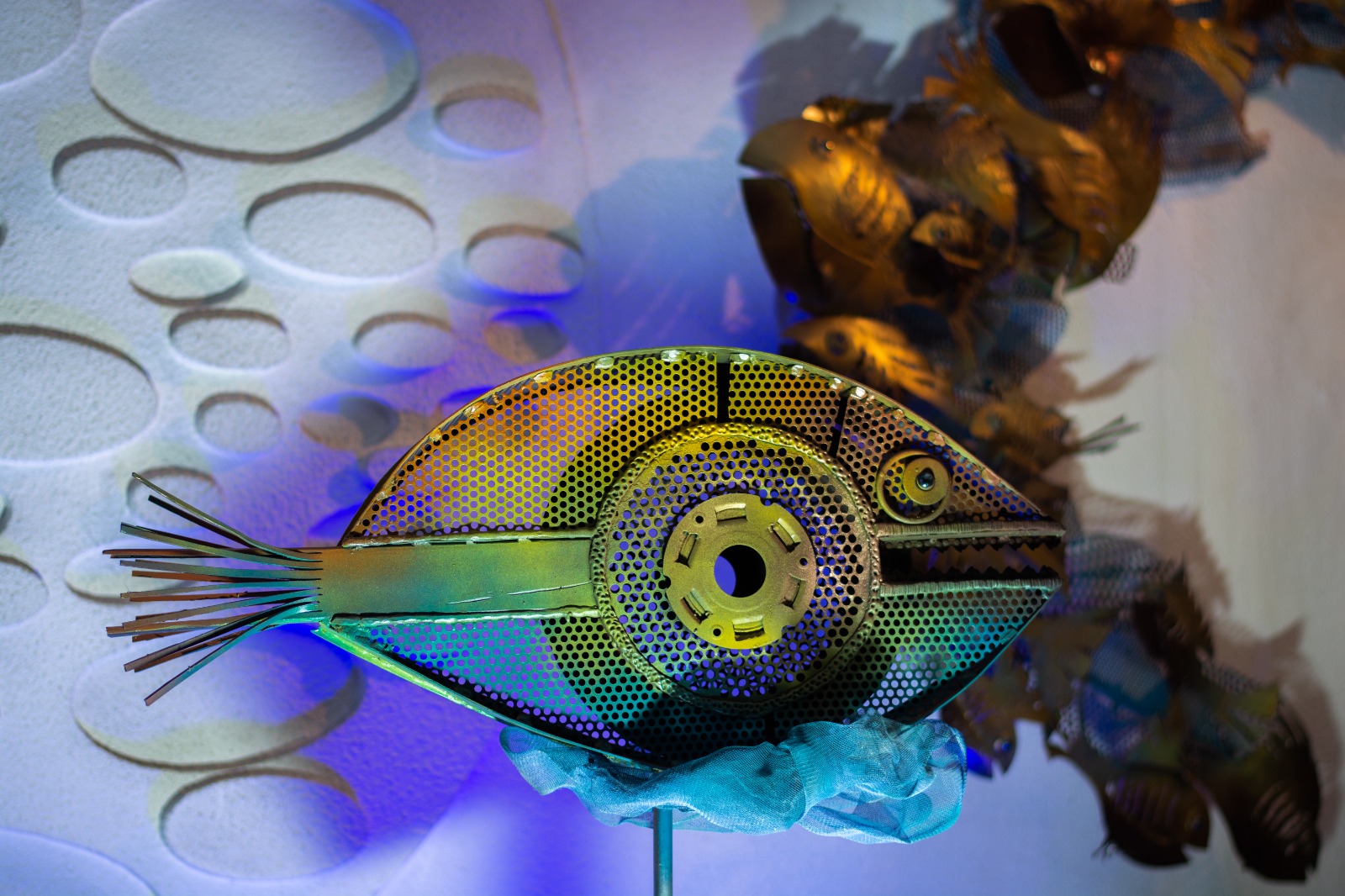 En 2020, con Vuelo -que se desplegó en el Centro Cultural Estación San Martín- Mirta Romero dio por concluidas sus exposiciones individuales en galerías. Distintas razones personales la llevaron a esa decisión, sin embargo, la artista visual sanjuanina jamás bajó los brazos. Por el contrario, inquieta como es, se sumergió aún más profundo en su arte, hasta llegar al "Misterioso Mundo Marino", habitado por maravillosas criaturas surgidas de su imaginación, que surcan océanos de tela mosquitera con sus cuerpos de chapa batida, madera, vidrio y elementos de descarte que le encanta reciclar. Esa es su nueva exposición individual, un corpus escultórico inédito de más de 20 obras que empezaron a nacer después de Vuelo y que decidió mostrar en sus redes, a través de fotografías tomadas por su nieta Clara Oviedo y de un video realizado por Pablo Pastor; imágenes que parecen tomadas en el mar o en un acuario. Y sin proponérselo, concreta de esa forma su primera exposición virtual, modalidad muy difundida tras la pandemia que hoy por hoy le permite trascender muros y tiempos para cumplir su deseo: compartir su arte con la gente.