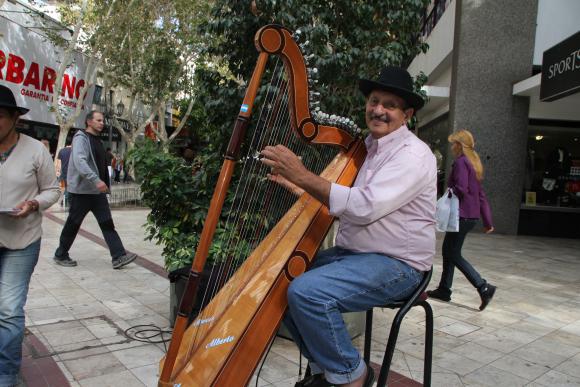 Por la Peatonal de San Juan es frecuente la presencia de músicos itinerantes que se ganan la vida tocando y cantando, con la ya clásica modalidad para ganar unas monedas, "a la gorra". Es el caso, por ejemplo, de Eduardo De Cabrera, quien suele ubicarse en la intersección de Tucumán y Rivadavia; y también de "El Grillo" Malbrán, que atiende siempre en su "oficina" de la peatonal Rivadavia. Pero en estos días, otras sonoridades muy distintas a las guitarras se hicieron parte de esta movida artística callejera. Y vienen desde muy lejos. Una llegó del Litoral, de Misiones, y la trajo Alberto Luján Albarado; y la otra arribó del Sur, Trelew, con la joven Nancy Richter.