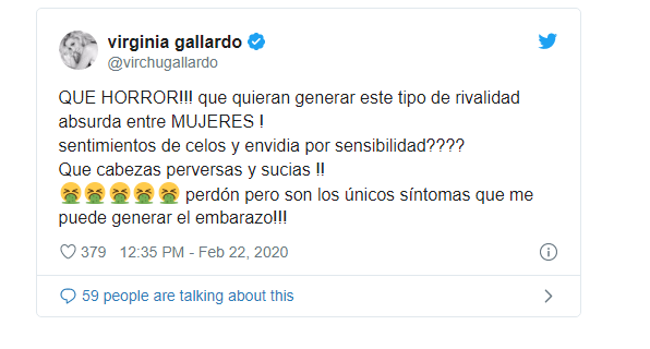 “¡Qué horror que quieran generar este tipo de rivalidad absurda entre mujeres! ¡Sentimientos de celos y envidia por sensibilidad? ¡Qué cabezas perversas y sucias!, disparó la blonda.
