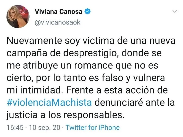 Al respecto, la presentadora realizó un fuerte descargo donde desmintió la versión y advirtió que irá a la Justicia: "Nuevamente soy víctima de una nueva campaña de desprestigio, donde se me atribuye un romance que no es cierto, por lo tanto es falso y vulnera mi intimidad. Frente a esta acción de #ViolenciaMachista denunciaré ante la justicia a los responsables". Por su parte, Berni todavía no hizo ninguna declaración al respecto.