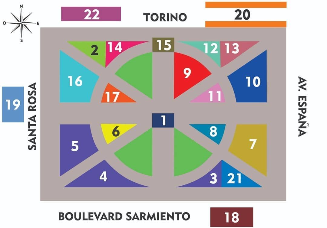 1– Escenario central 2– Bibliotecas populares 3, 4 y 5– Stands editoriales 6– Feria de Lectura infantil 7– Fecir- Cinema Sur 8– Concejo Deliberante 9– Muestra Evita 10– Espacio literario 11– Cuenta Cuentos 12– Muestra Tiranosaurus Rex 13– Biblioteca Sarmiento Legislador 14– Red comunitaria cultural 15– Escenario de la música 16– Arte joven e Historieta argentina 17– Murgas comunitarias 18– Centro de Convenciones 19– Biblioteca Mariano Moreno 20– Espacio de artesanos 21– Medios de comunicación 22– Bibliomóviles.