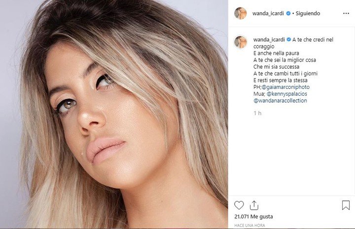 En tanto, la hermana de Zaira (30) también publicó una foto de su rostro en primer plano con otro fragmento de la balada antes mencionada."A ti que crees en el coraje y también en el miedo. A ti que eres lo mejor que me haya pasado, a ti que cambias todos los días y sigues siendo siempre la misma", fue el párrafo que transcribió Wanda en ese posteo.