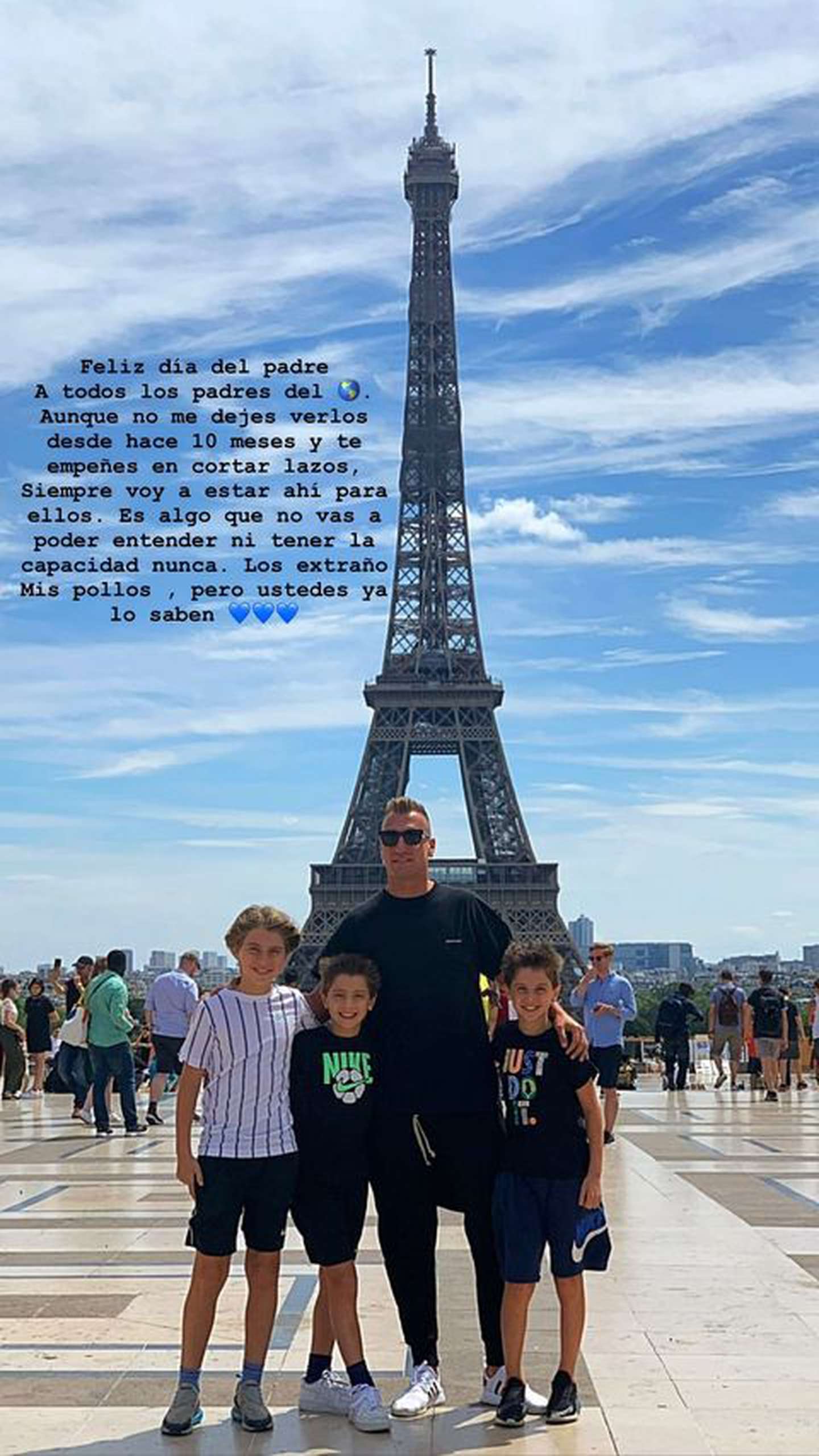 “Aunque no me dejés verlos hace diez meses, y te empeñes en cortar lazos, siempre voy a estar ahí para ellos. Es algo que no vas a poder entender ni tenés la capacidad nunca”, escribió el futbolista en un posteo que acompañó con una foto de Valentino, Constantino y Benedicto abrazados en París, con la Torre Eiffel de fondo.