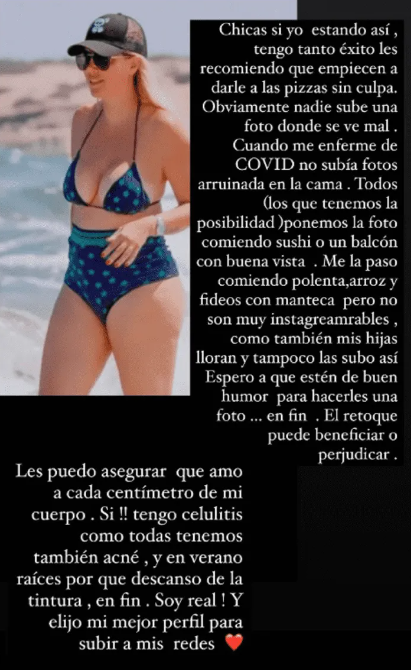 Al final, Wanda Nara se describió como una persona igual que cualquier otra: “Les puedo asegurar que amo cada centímetro de mi cuerpo”. “¡Sí, tengo celulitis como todas tenemos! También acné. Y, en verano, raíces porque descanso de la tintura. En fin, soy real. Y elijo mi mejor perfil para subir a mis redes”, cerró la historia.
