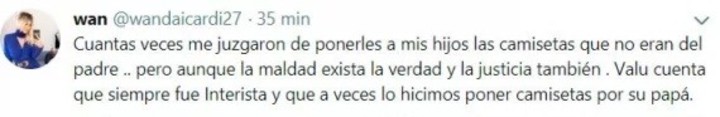 “Cuántas veces me juzgaron por ponerles a mis hijos las camisetas que no eran del padre (en referencia al ex River). Pero, aunque la maldad exista, la verdad y la justicia también. Valu cuenta que siempre fue Interista y que a veces lo hicimos poner camisetas por su papá“, escribió Nara.