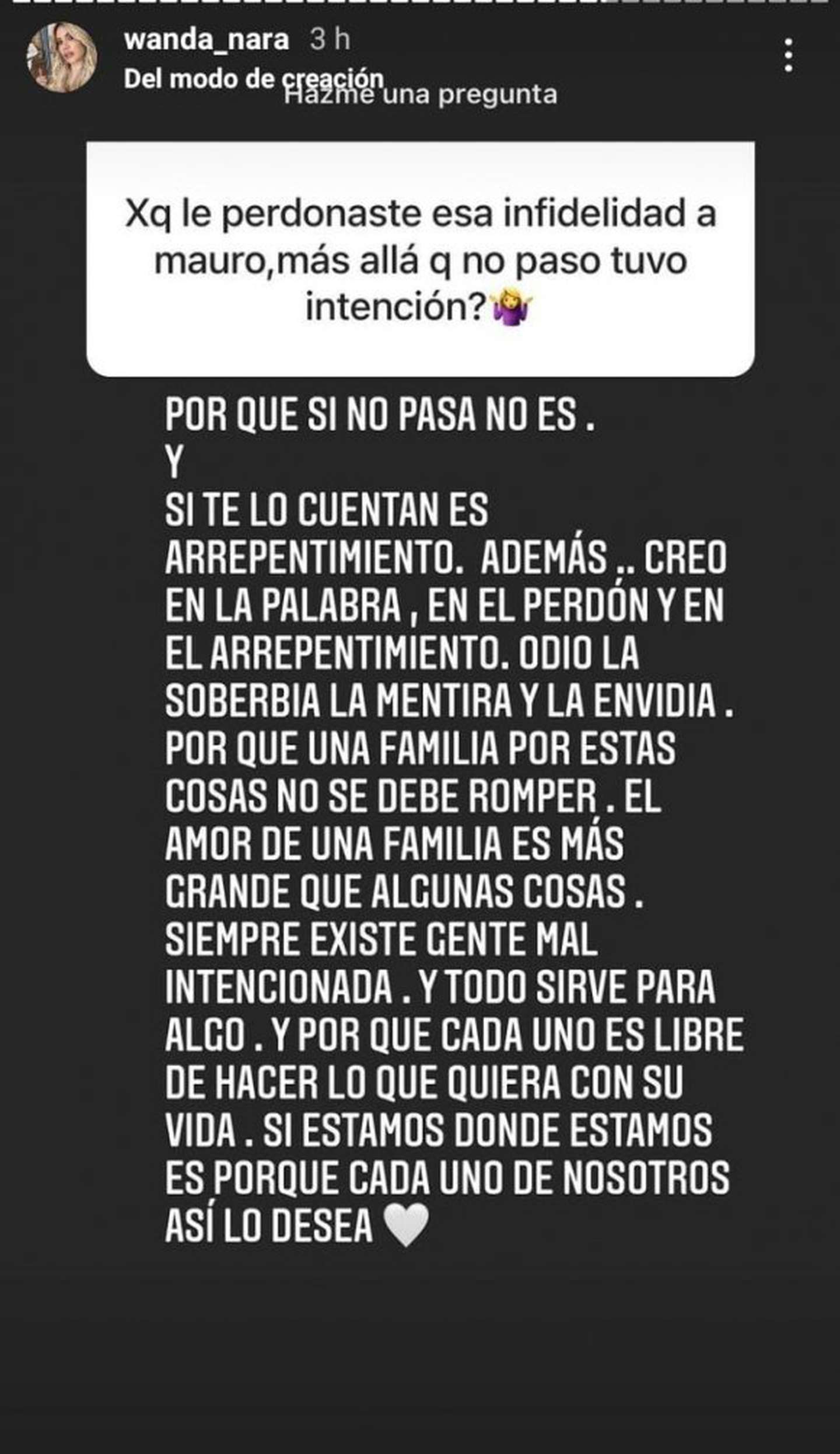 Wanda, también, cerró con un palito hacia la China Suárez, sin nombrarla. “Siempre existe gente mal intencionada, y todo sirve para algo. Cada uno es libre de hacer lo que quiera con su vida. Si estamos donde estamos es porque cada uno de nosotros así lo desea”, dijo, junto a un emoji de un corazón.