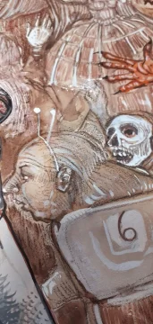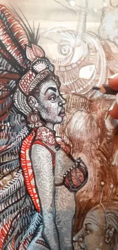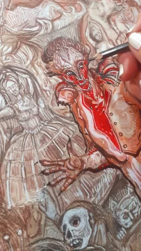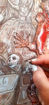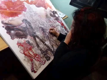 La obra en cuestión, que obtuvo el tercer premio en el certamen “Juego de Damas” y que ahora pertenece a una colección privada, es una pieza de gran formato que condensa años de observación. “La idea era justamente armar una serie de obras de gran formato, solo con tinta. Es todo un desafío pasar dibujo a tela, a soporte bastidor”, relató a DIARIO DE CUYO Alejandra sobre el proceso de llevar la minuciosidad de sus cuadernos a una escala mayor. La elección de la tinta china negra y el rojo no fue arbitraria; buscó un impacto visual que obligara al espectador a detenerse en la maraña de personajes que habitan su lienzo.