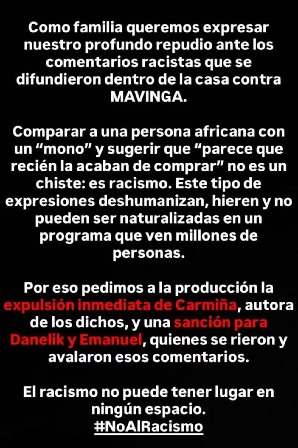 La reacción de la familia de Mavinga había sido inmediata desde que se conocieron las imágenes. A través de la cuenta oficial de Instagram de la participante, que administran sus seres queridos mientras ella permanece dentro de la casa, compartieron un comunicado en el que repudiaron los dichos y exigieron medidas concretas. “Comparar a una persona africana con un mono y sugerir que parece que recién la acaban de comprar no es un chiste: es racismo”, expresaron. También remarcaron que ese tipo de frases “deshumanizan, hieren y no pueden ser naturalizadas en un programa que ven millones de personas”.