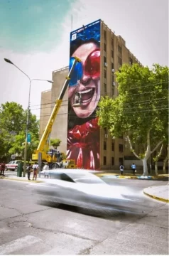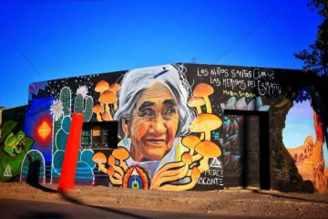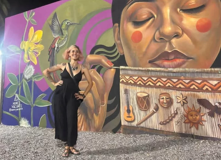 Con una trayectoria consolidada en el muralismo sanjuanino Mercedes Yacante tiene 36 años y su camino en el arte público comenzó formalmente hace una década, en el recordado “Mansooo Encuentro de Muralistas“. Desde entonces, ha dejado su sello en diferentes puntos de la provincia, como el del edificio ubicado en Av. Alem y Mitre (en conjunto con Matías Ruarte y Marcos Díaz), o “Nativos de Argentina”, con rostros de nativos de distintas tribus de Argentina (en España y Rivadavia) y el que pintaron dentro el Anfiteatro El Globito (también con Díaz), por citar apenas tres. Sin embargo, este nuevo mural en el Chalet Cantoni tiene una carga simbólica especial por su temática social y cultural.