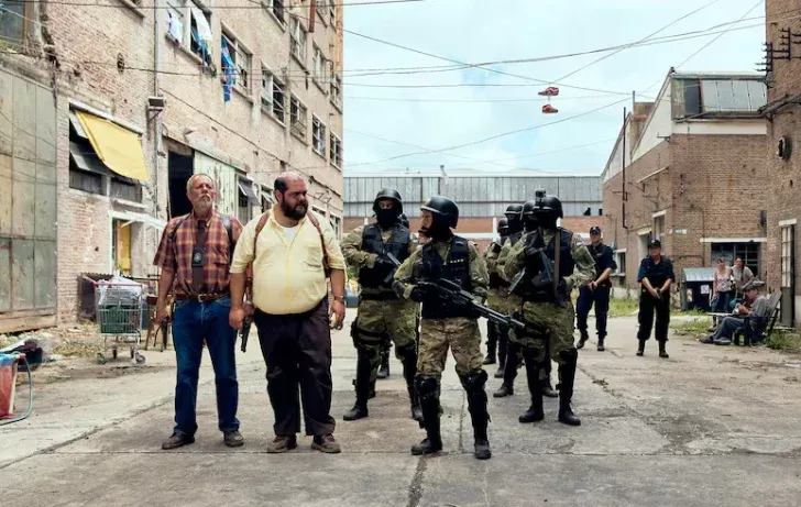 El set está montado sobre una antigua fábrica de pinturas que simula una villa de emergencia. Los artistas y el equipo de producción se enfocan para sumergirse en la estética y el ritmo policial de la ficción.