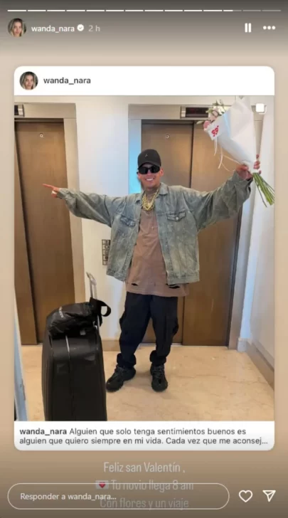 Fue Wanda Nara la que arrancó la mañana compartiendo en sus redes la sorpresa que recibió de parte de L-Gante. “Feliz San Valentín. Tu novio llega 8 AM con flores y un viaje”, escribió Wanda Nara en la publicación, donde se lo ve al artista sonriendo en la puerta de la casa con pasajes a destino misterioso.
