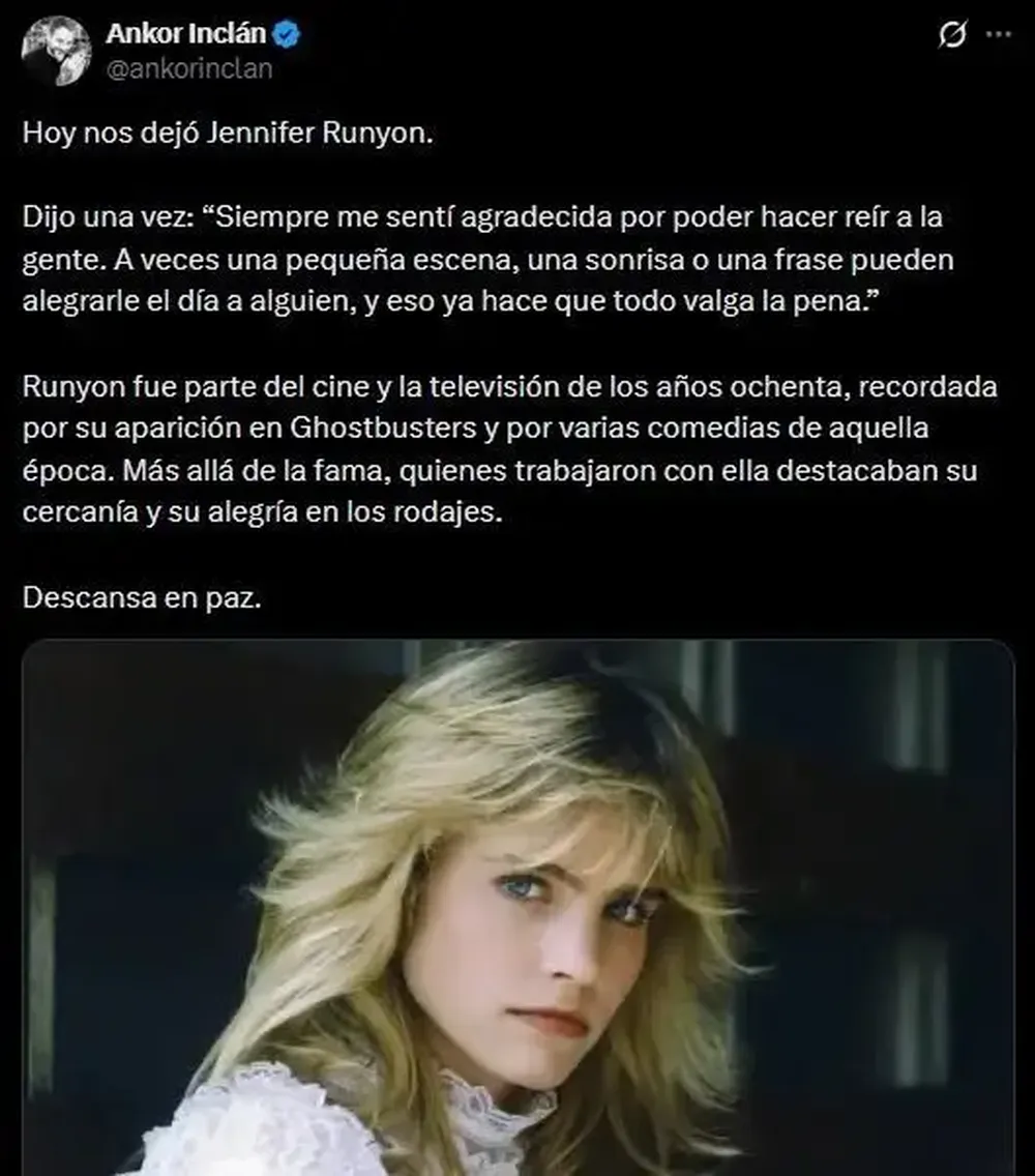 El mundo del cine y la televisión despide a Jennifer Runyon. La actriz, famosa por sus papeles en la exitosa película Los Cazafantasmas y la comedia Charles in Charge, murió a los 65 años. Su círculo íntimo comunicó el triste desenlace a través de una publicación en Facebook.
