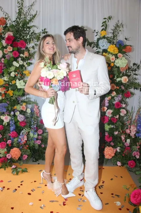 La novia lució un vestido corsetero mini con stilettos siguiendo el white code, accesorios plateados con pelo suelo al viento y el novio siguió la misma línea del total white.