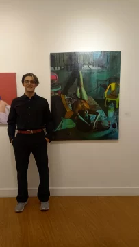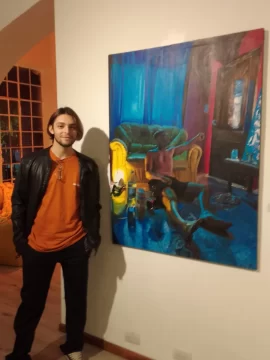 “Lo que intento representar sería como una realidad cruda, melancólica y fantástica a la vez. Creo que la gente ve que mis pinturas son oscuras y coloridas a la vez”, sumó acerca de su trabajo en general, y en particular de este acrílico sobre lienzo que “combina realismo y un poco de surrealismo, con una paleta de colores propia de mis pinturas, que sería verdosa, como mohosa”. Un sello propio que se fue construyendo a través de la experimentación y la producción, pero –reconoce- abonadas por los aprendizajes que le dejó su paso por la carrera de Artes Visuales en la UNSJ.
