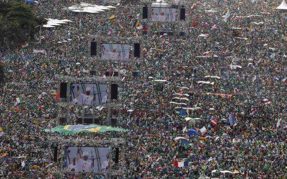Intercalando párrafos en castellano y en portugués, el primer papa latinoamericano de la historia expresó: ‘Jesús cuenta con ustedes. La iglesia cuenta con ustedes. El papa cuenta con ustedes‘, despertando la ovación de los millones de jóvenes que, en un campamento a cielo abierto, pasaron la noche en la arena de la playa más famosa de Brasil.