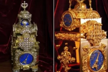 Sergei Karelin, miembro de la Unión de Artistas de Rusia, es quien inventó este "reloj para el planeta Tierra", una joya fabricada en latón y plata alemana, con una ornamentación exterior de tipo barroco, cubierta de zircones, rubíes y diamantes.