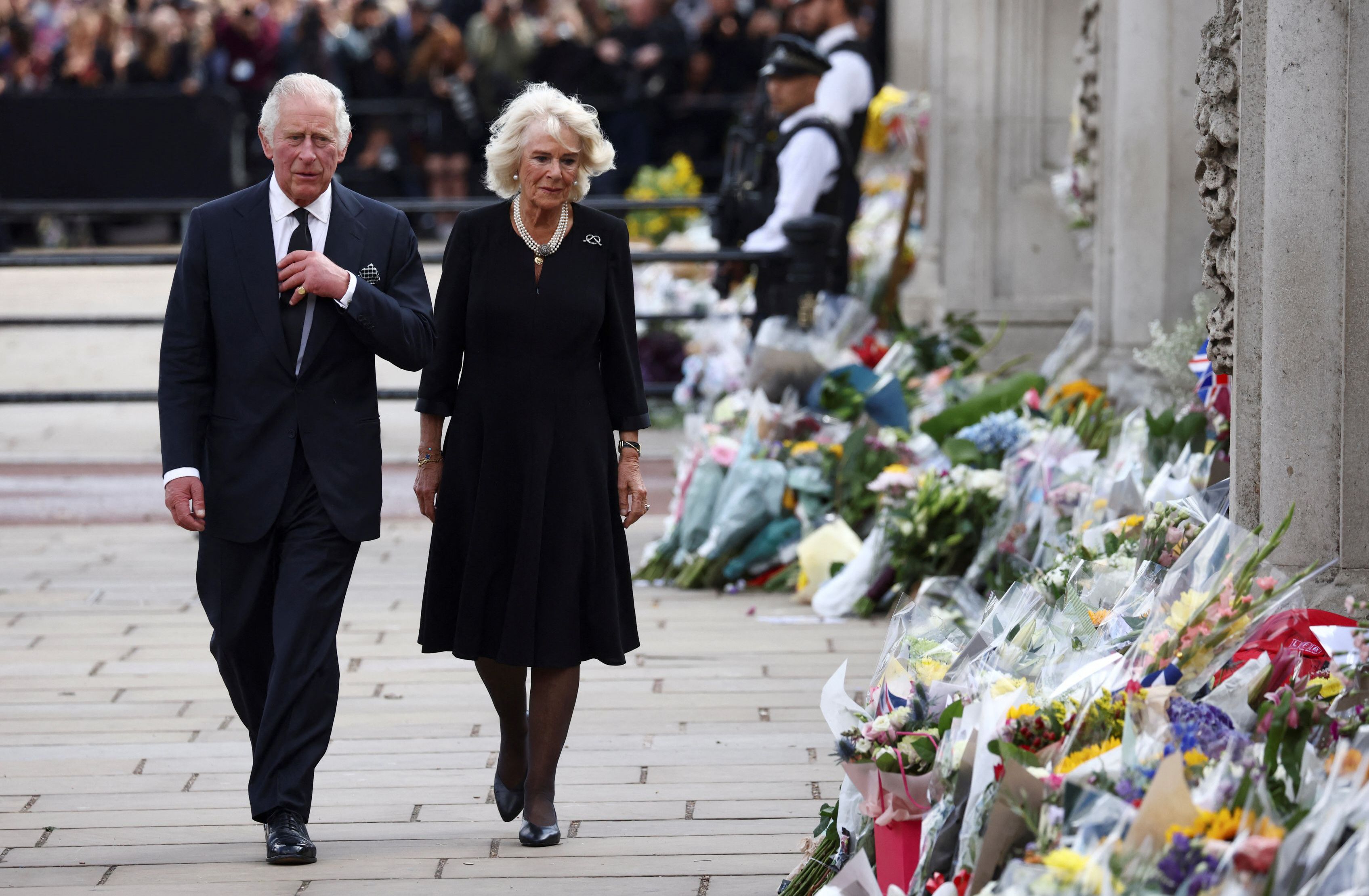 Con Camila. El rey paseó con su esposa Camila por las afueras del Palacio de Buckingham, rodeado de ofrendas florales para Isabel.