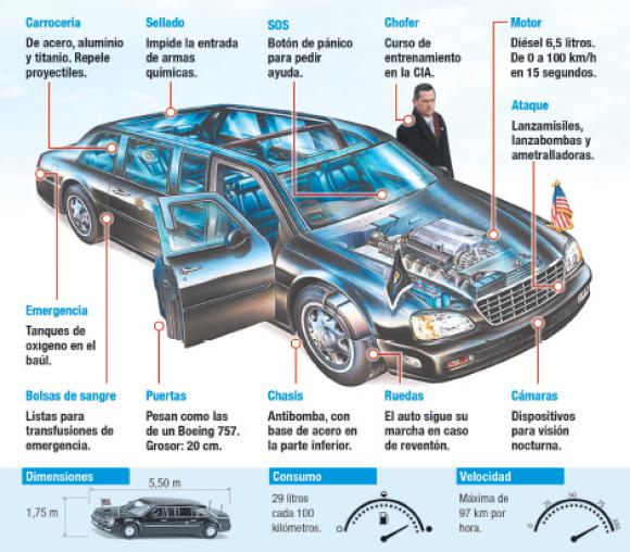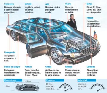 El vehículo oficial supo ganarse su apodo por ser un verdadero tanque de guerra: resiste bombas, disparos y armas químicas como ningún otro automóvil. Además, cuenta con tecnología avanzada para lanzar misiles y cámaras con visión nocturna, entre otras características que parecen de una historia de ciencia ficción.