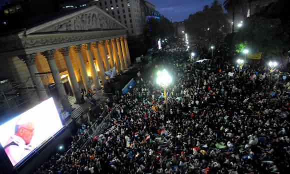 Eran las 3:30 de la madrugada cuando una voz sorprendió a 50.000 almas en una plaza somnolienta que ya había cantado, bailado y agitado banderas argentinas y papales hasta caer rendidos esperando la hora clave de la misa de asunción del nuevo Papa. Toda la Catedral porteña se estremeció: era el papa Francisco que llamaba a sus fieles porteños que los acompañaron y alentaron por tantos años.