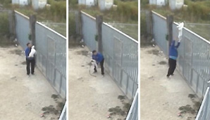 Dos hombres fueron captados por las cámaras de un centro de ayuda a animales, cuando abandonan a su perro tirándolo por arriba de la reja de la perrera.