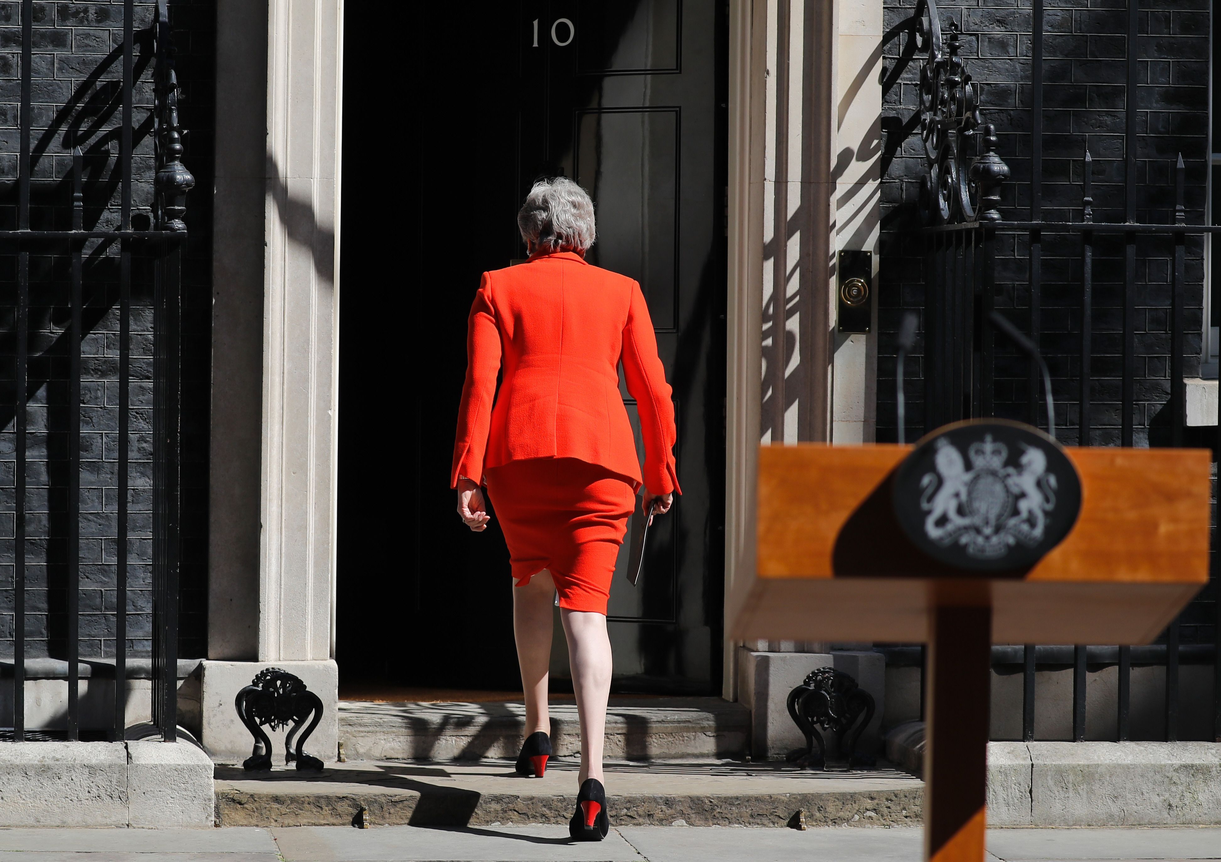 Se retira. La primera ministra británica, Theresa May, se retira después de anunciar su renuncia fuera de la calle Downing 10 en el centro de Londres.
