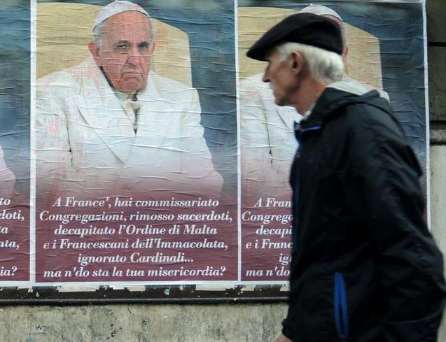 Más abajo, con fondo violeta, aparece una leyenda escrita en dialecto romano: ‘Has comisariado Congregaciones, removido sacerdotes, decapitado la Orden de Malta y los Franciscanos de la Inmaculada, ignorado Cardenales… ¿dónde está tu misericordia?‘, se preguntan los afiches que con el rostro del Pontífice se ven en las calles aledañas al Vaticano.