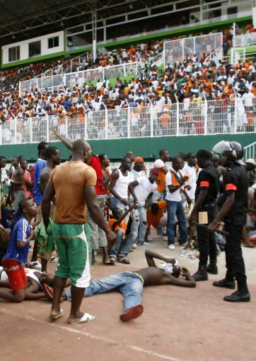 En Abidjan, la capital marfileña, y antes del inicio del partido, un muro del estadio Houphouet-Boigny cedió y cientos de hinchas entraron en pánico.