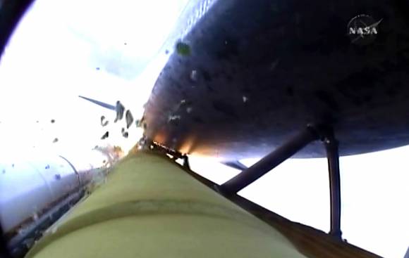 Una cámara montada en el tanque de combustible registró el desprendimiento de ocho o nueve trozos de hielo o espuma aislante durante el lanzamiento. "Hemos visto algunos desprendimientos de espuma", dijo Bill Gertesnmaier, jefe de operaciones espaciales de la NASA.