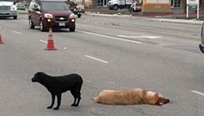 Una labradora fue filmada mientras protegía el cuerpo de otro perro atropellado por un auto en el sur de California. Mirá el conmovedor video.