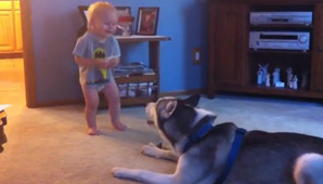 Mirá la divertida "conversación" entre un siberiano y un bebé. El pequeño salta y grita mientras el mejor amigo del hombre le contesta con ladridos.