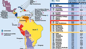 El promedio mundial de bancas ocupadas por mujeres en los parlamentos del mundo es de 19,7% y el continente americano en su conjunto llega al 22,6%, particularmente gracias al aporte de países como Nicaragua (40,2%), Costa Rica (38,6%) y Argentina (37,4% en la cámara baja y 38,9 en el Senado). Párrafo aparte merece Cuba, que figura al tope de la lista de países latinoamericanos con un 45,2% de bancas en manos de mujeres pero en una asamblea desprovista de poder real y surgida de un sistema de partido único.