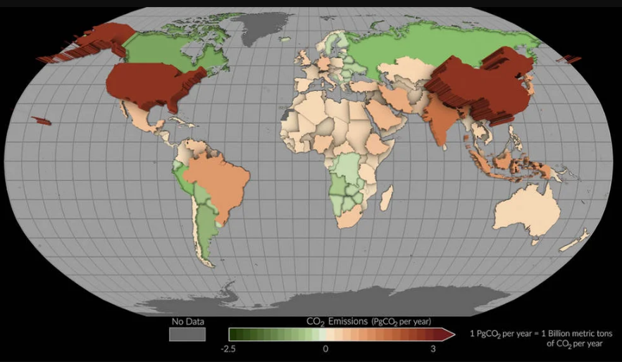 Los países más contaminante según el mapa son China, con más de 10.065 millones de toneladas de CO2 emitido, Estados Unidos, con 5.416 millones de toneladas de CO2, India, con 2.654 millones de toneladas de CO2 y Rusia, con 1.711 millones de toneladas de CO2. De acuerdo a un estudio de Global Carbon Budget de fines del 2022, las concentraciones globales de CO2 establecieron un nuevo récord de 417,2 partes por millón (ppm), es decir 2,5 ppm más que los niveles de 2021. Actualmente, las concentraciones atmosféricas de CO2 están un 51% por encima de los niveles preindustriales.