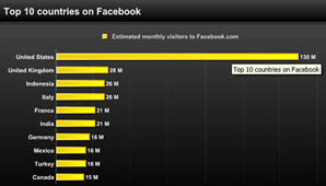 En el primer puesto sobresalen los Estados Unidos con 130 millones de usuarios, seguidos por el Reino Unido con 28 millones, Indonesia con 26 millones, Italia con 26, Francia con 21, India con 21, Alemania con 18, México y Turquía con 16, y Canadá con 15 millones de usuarios.