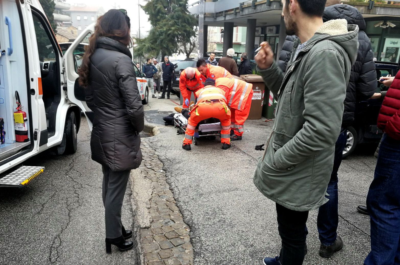 Con los heridos. Miembros de asistencia sanitaria atienden a uno de los heridos tras los disparos en la tranquila ciudad italiana de Macerata, en el centro del país.