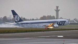 Según Leszek Chorzewski, vocero de la compañía, "el avión aterrizó sobre la panza, en la pista regada de sustancias que retardan el estallido del fuego". El aparato tenía a bordo 220 pasajeros y once tripulantes.