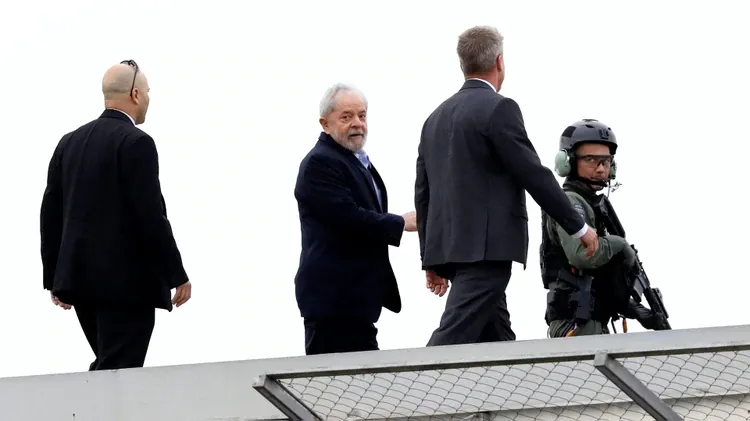 Lula, con traje oscuro, sin corbata y de cabellos totalmente blancos, fue trasladado en medio de un intenso dispositivo de seguridad, y escoltado de cerca por tres agentes de la Policía Federal.