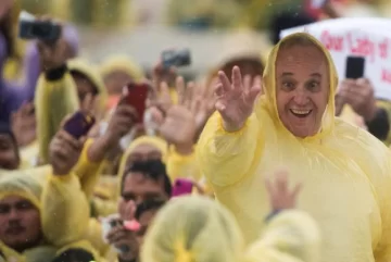 Con un piloto amarillo de plástico para protegerse de la intensa lluvia, Francisco habló frente a unas 200.000 personas en esa nación insular asiática, aunque debió suspender sus planes de pasar todo el día en Tacloban y sus alrededores, devastados por el tifón hace 14 meses.